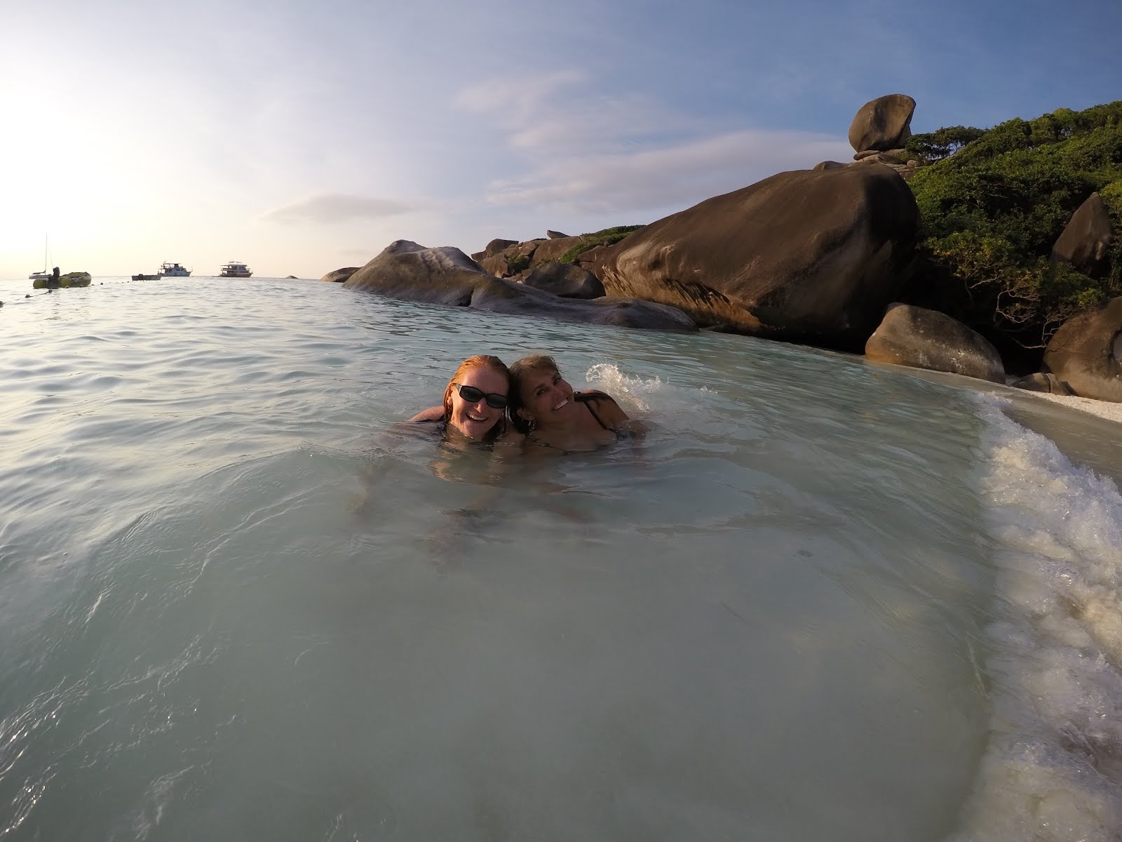 Picture the perfect tropical island with palm trees, white, white sand, turquoise water, green foliage and interesting rock formations.  This is the Similan Islands.  Stunningly postcard perfect.  And Popeye floating serenely on clear water, as if suspended by magic above coral outcrops, teaming with colourful schools of all varieties of fish.